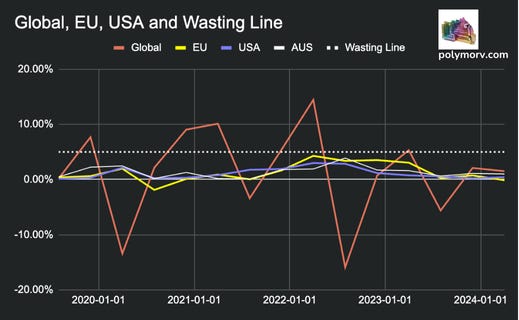 It may not come as a surprise that as food prices increase, nutrition and diet quality decrease. Sure, food consumption behavior is complex, but there is evidence showing that a 5% increase on groceries over a three month period is associated with a 9% higher risk of wasting (acute malnutrition) and 14% risk of severe wasting. These data are for populations that already have risks of food scarcity. If there was only a 5% increase in groceries globally these past five years, we would be lucky. Check out this graph I compiled of food pricing changes every three months over the past five years1234: