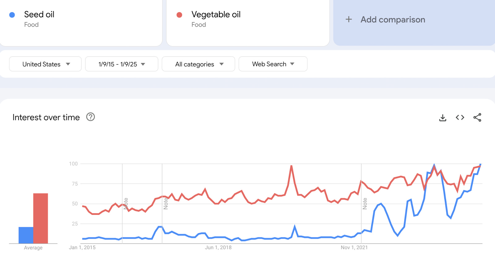 With the new administration coming in and looking to cut or reform everything in sight, you probably have heard about Robert Kennedy’s War on Seed Oils. Though, if you look at Google Trends, no one other than commodity traders differentiated seed oils much from vegetable oils until 2021.
