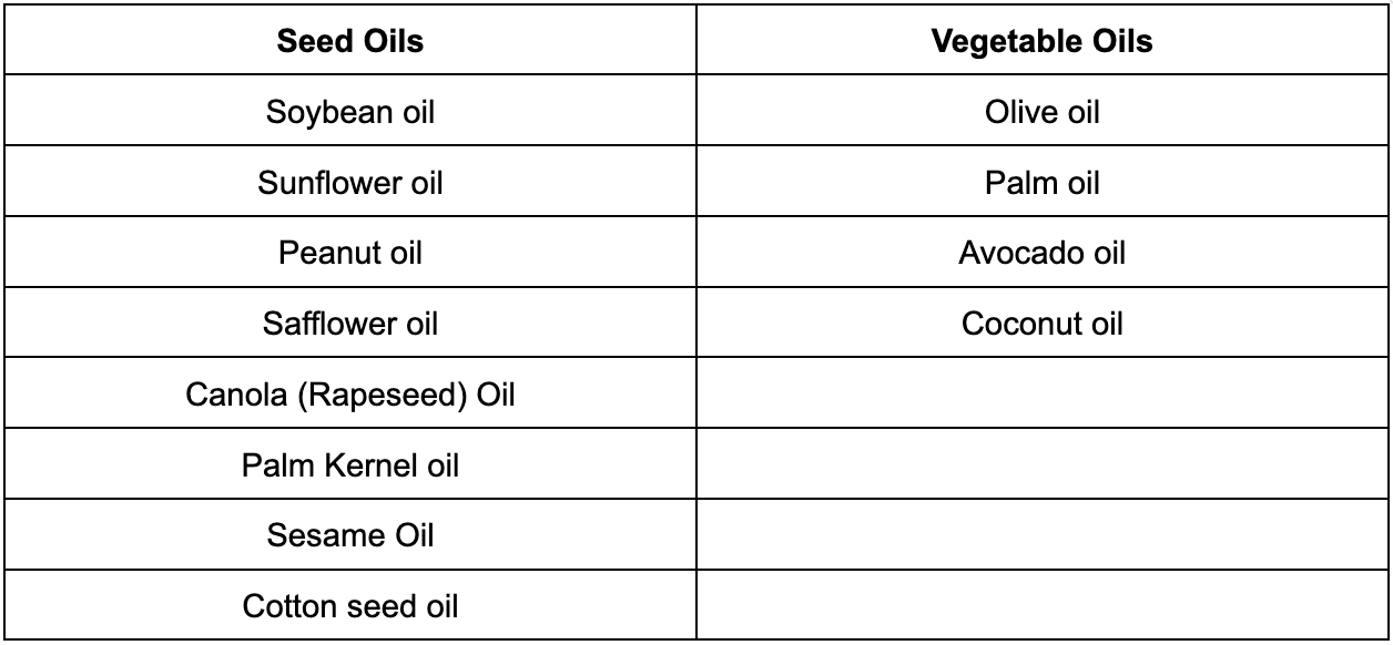 All seed oils are vegetable oils, but not all vegetable oils are seed oils. Many of these seeds are grains, legumes or other staples that we consume in other forms, processed in a way that allows us to extract their oil. This is distinct from olive oil, where the oil comes from the fruit itself, not the pit (seed) inside. For those who aren’t fans of olives with pits, avocado oil works similarly: the fat is removed from the fruit, and the pit or seed is discarded.